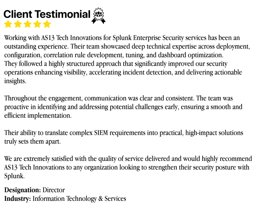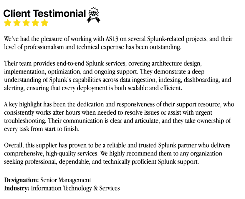 At AS13, we help enterprises unlock the full potential of their data ecosystem through expert-led consulting, seamless SIEM migrations, and performance optimization. Whether you are scaling to the cloud, troubleshooting inefficiencies, or looking to reduce licensing costs, we ensure your Splunk investment delivers measurable ROI.