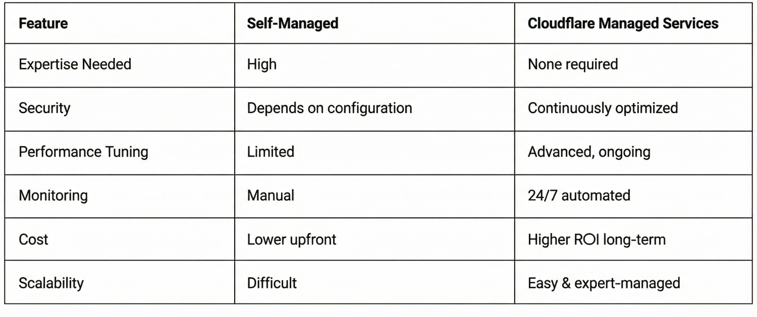 In simple terms, you get Cloudflare’s power + expert handling, without needing in-house specialists.