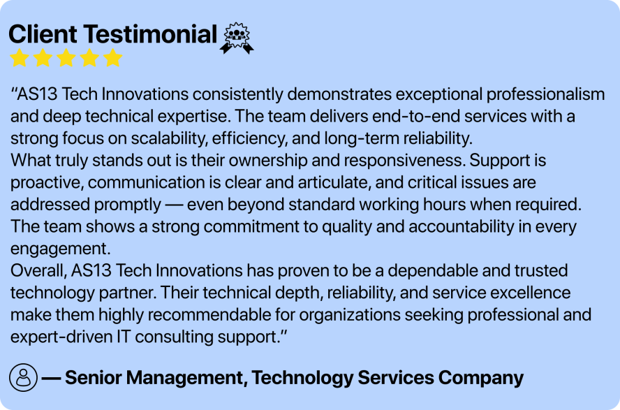 AS13.AI helps organizations build reliable, high-performance, and secure digital ecosystems. From cloud adoption and infrastructure management to cybersecurity, managed IT, and advanced automation, we deliver solutions that strengthen operations and drive long-term business growth.