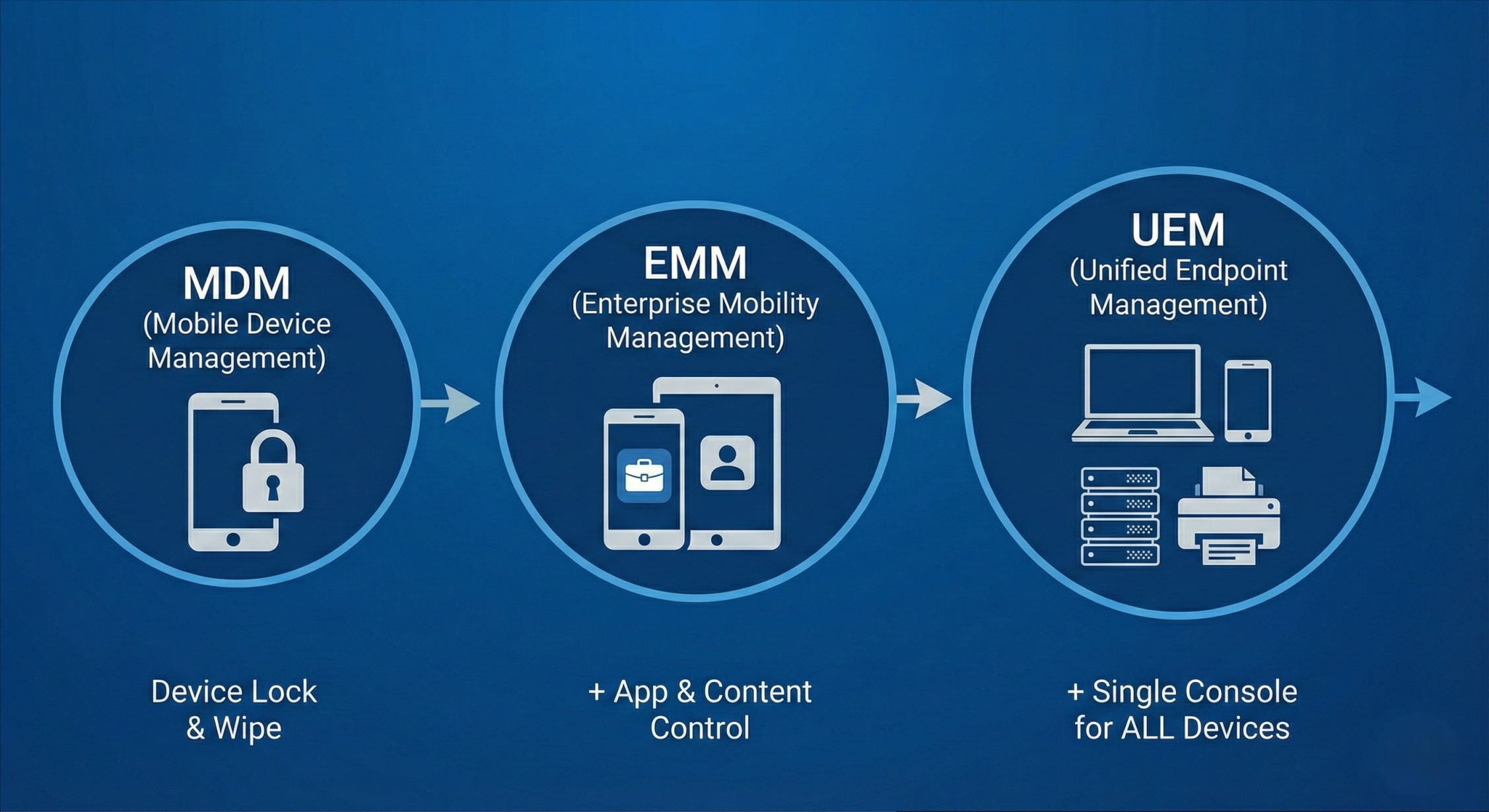 MDM (Mobile Device Management) was the first wave, born out of the smartphone revolution. It focuses strictly on managing mobile devices (phones and tablets). It allows IT to provision devices, enforce passcodes, and remotely wipe data if a device is lost or stolen.